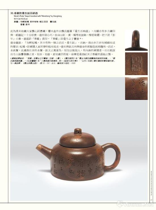 壶身题铭:‘勿轻裋褐,其中有物,倾之活活,曼生铭’。当代大石斋唐云(1910-1993)所藏清郭频迦题字,朱石某摹《茗壶二十品》,所勾绘的曼生壶式中,即有此百衲式及铭文。此手稿首页题‘陶冶性灵 频迦’,右署‘承名世钩朱石某摹本’,是以前鉴别和仿制曼生壶的底册。